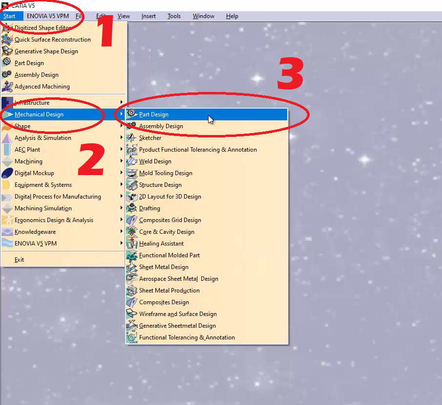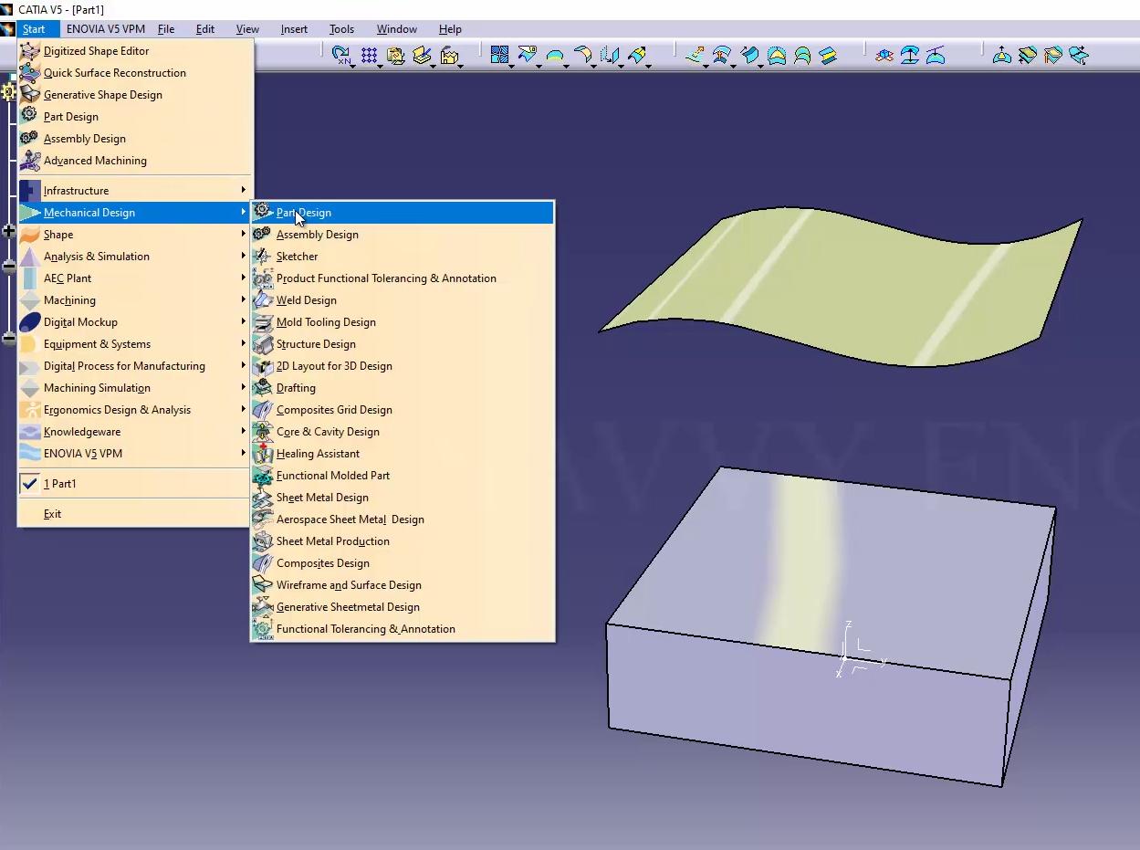 First, Click Start, Mechanical Design, then Part Design Workbench.