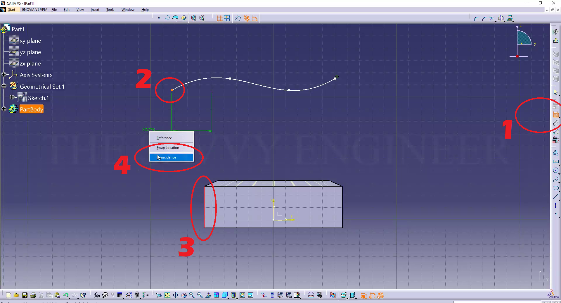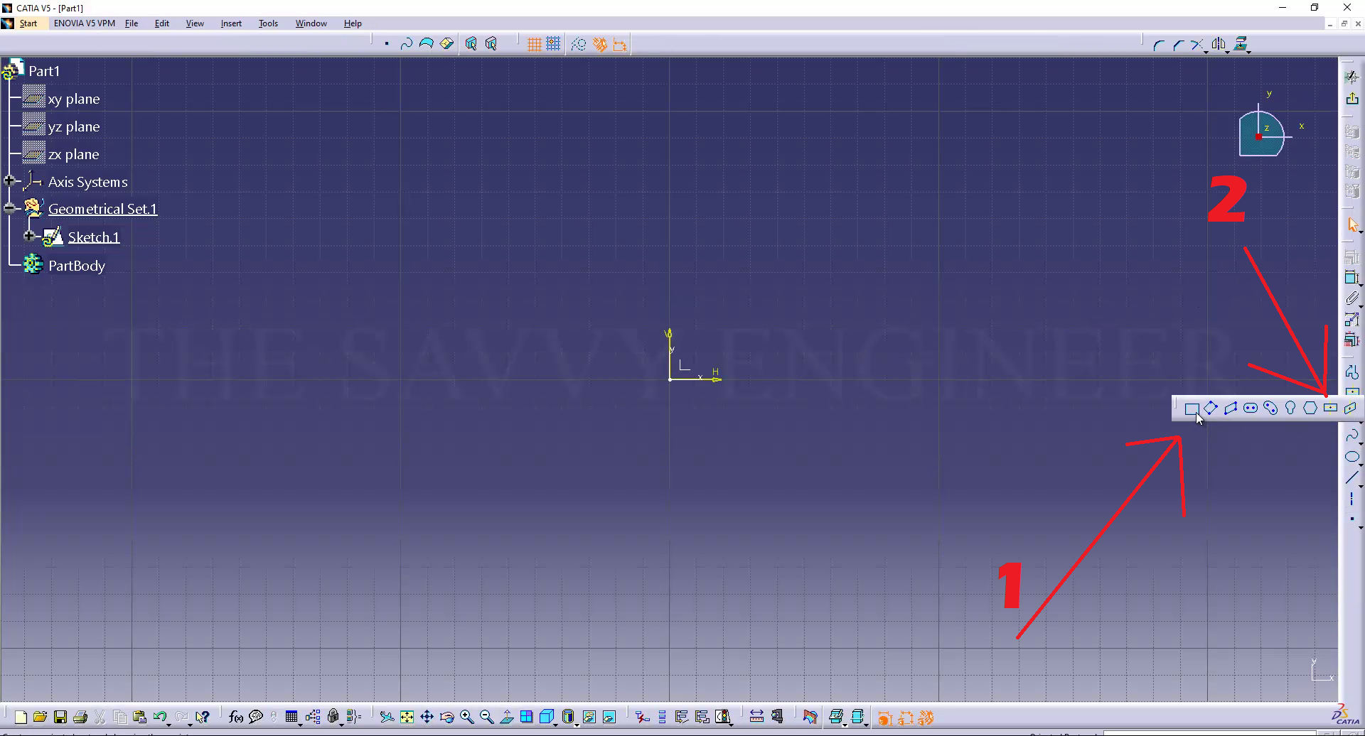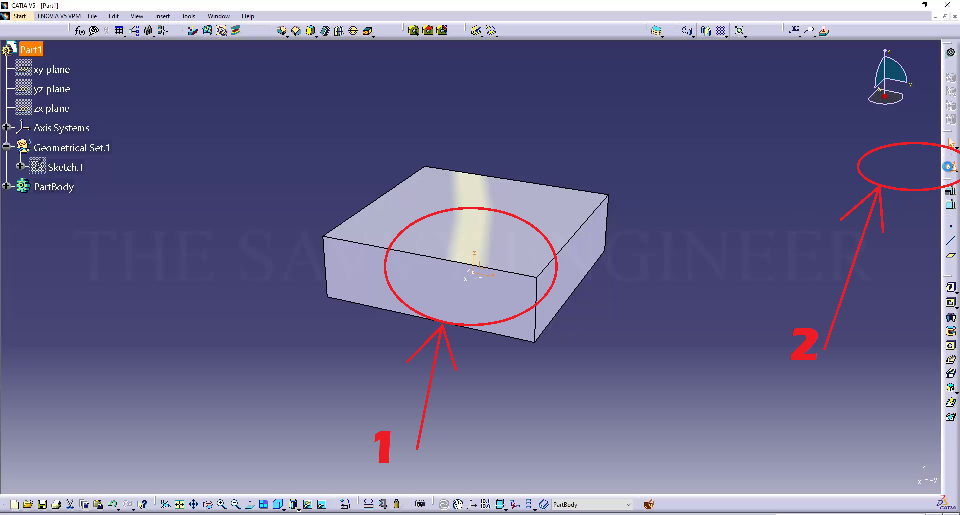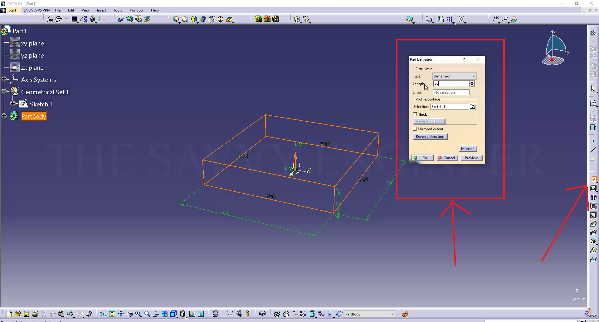 Now, Click on the Pad Command. You will get the following warning message, ‘the current in Work object isn’t in a Body. the new solid feature is created after the last feature of the Partbody.‘ This means, if you will create a solid part, for instance an extrusion, it will be saved under the Partbody, and the sketch, for instance the centered rectangle will be saved under the geometrical set. Next, Click on OK.