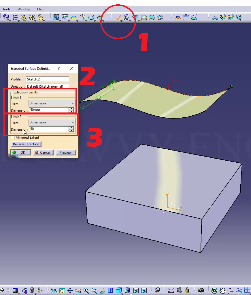 Select the spline, Go to the extrude command, add 50mm to the first limit and 50mm to the second limit. Then Click on OK.