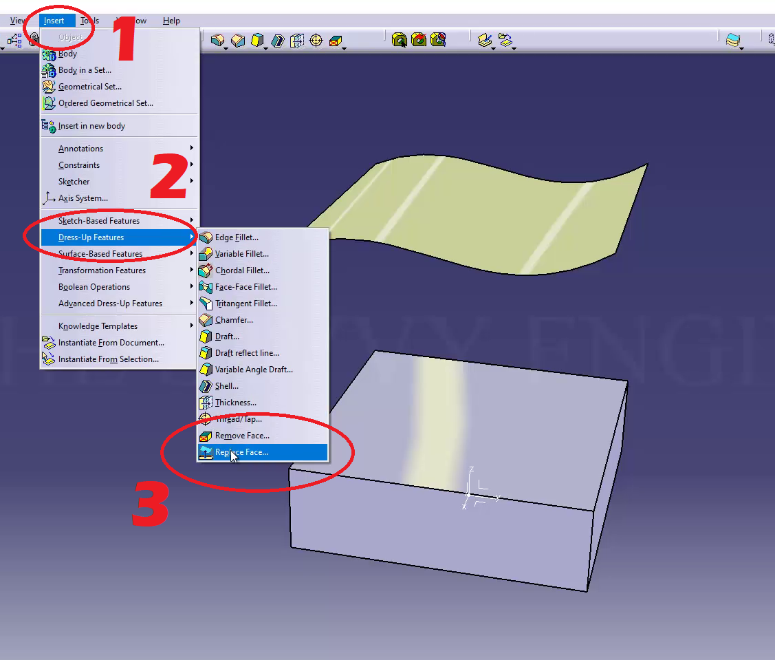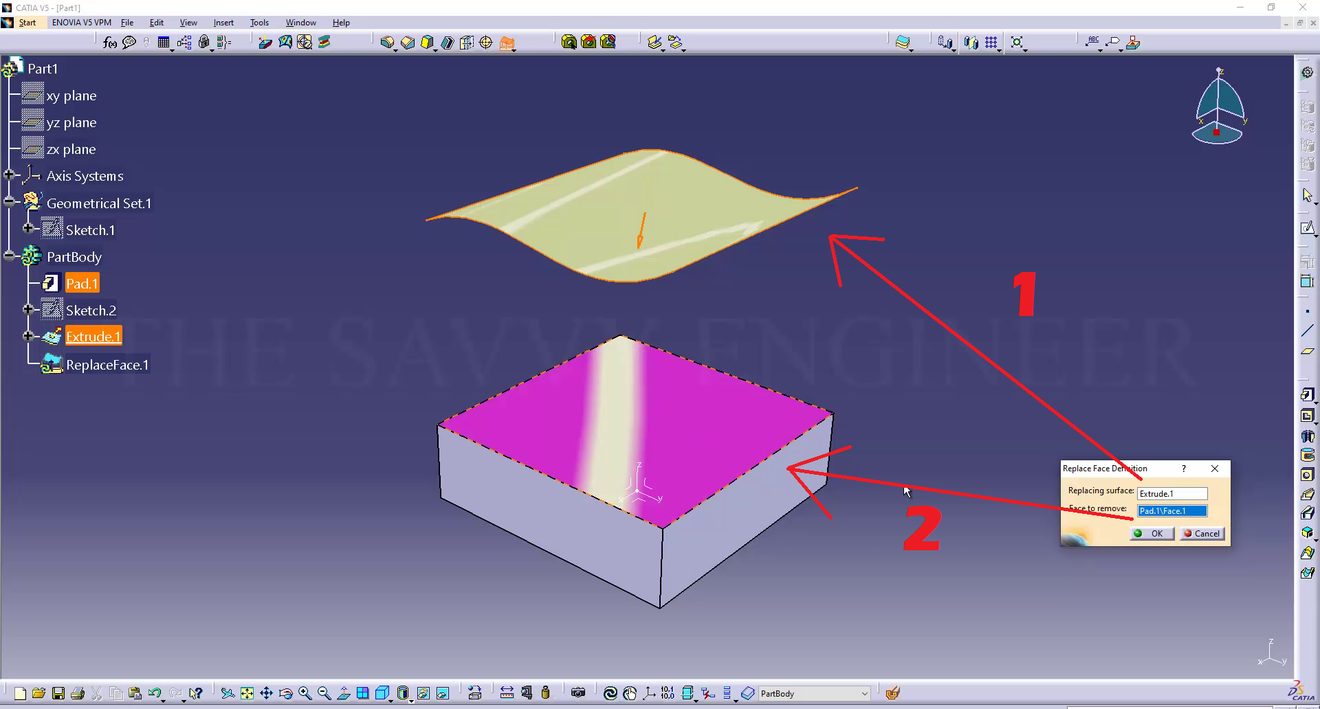 Select the replacing face field, then click on the surface. Next, select the face to remove field, click on the top face of the extrusion, then click on OK.