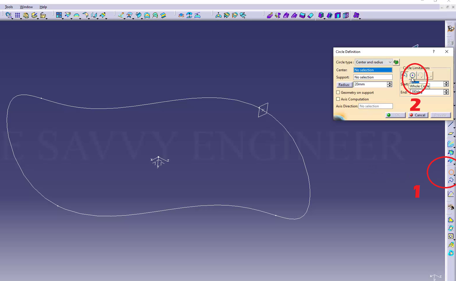For the Center, Click on the Point.1, then select the plane.1 as a support. Change the radius value from 20mm to 5mm, then click OK.