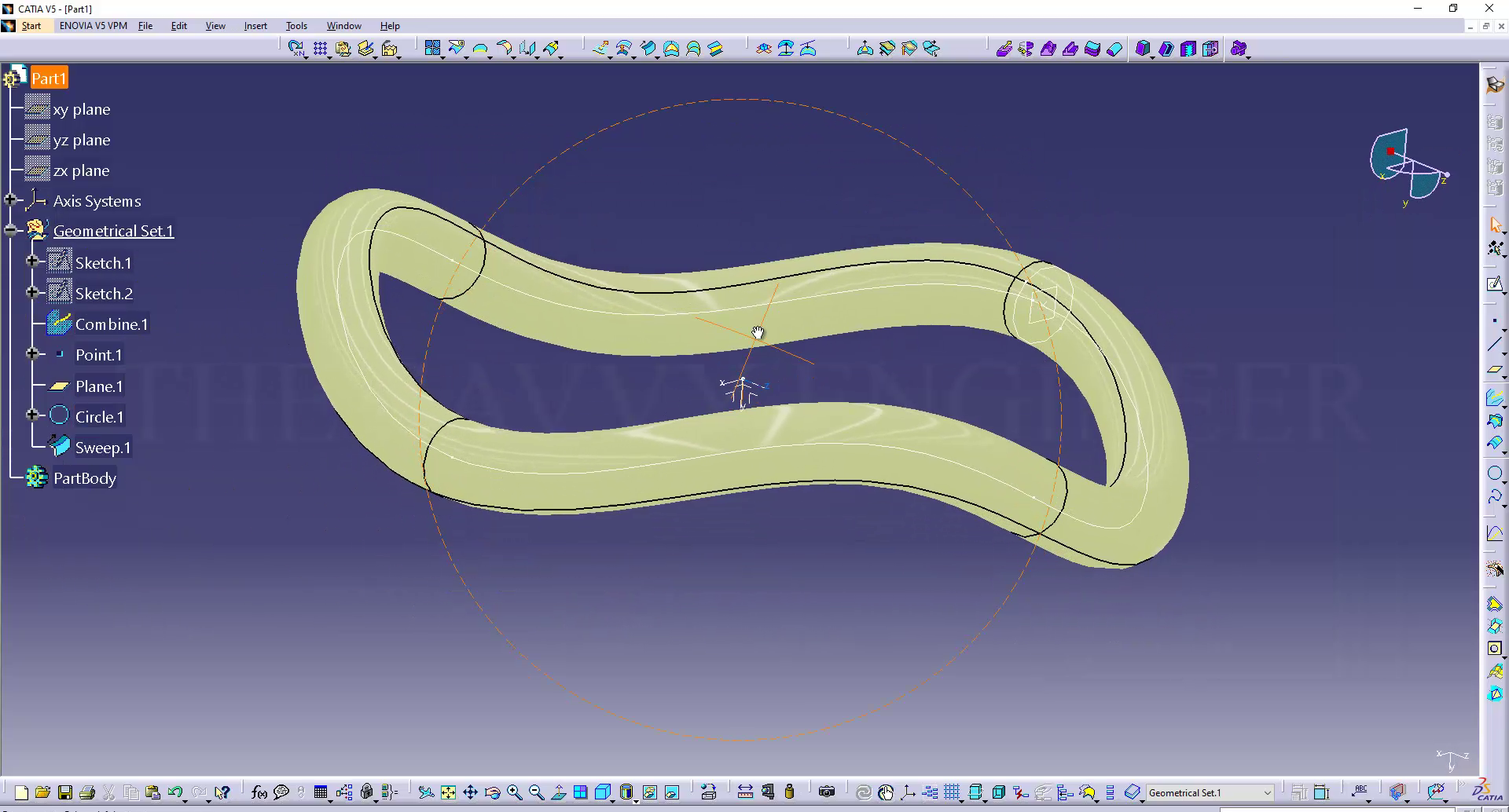 Go to the swept surface command, select the circle.1 as a profile, then select the combine.1 as a guide curve. Next, Click on OK.