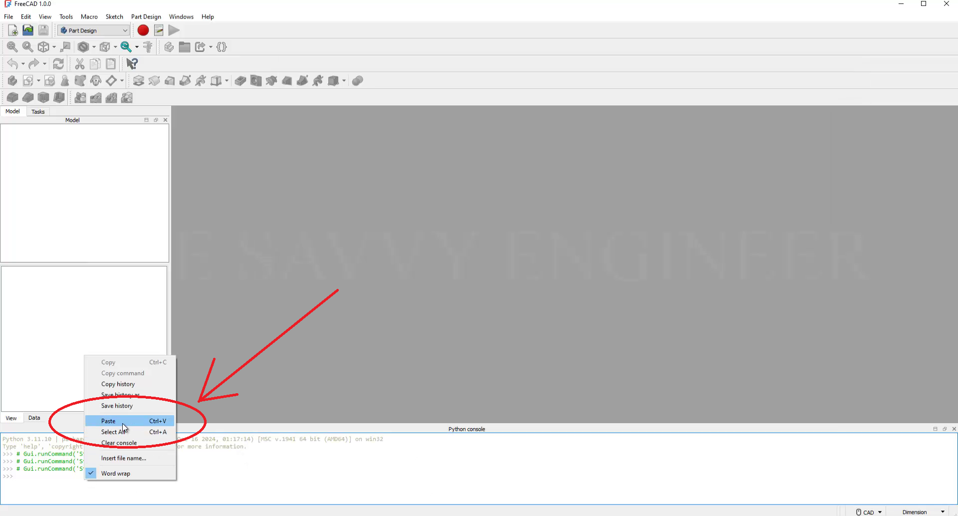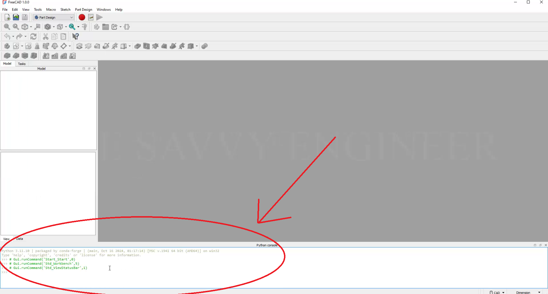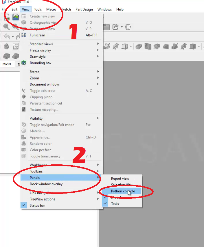 First, open your FreeCAD Software, we are going to show the python console, and to do this go to view, panels, then click on the python console command.