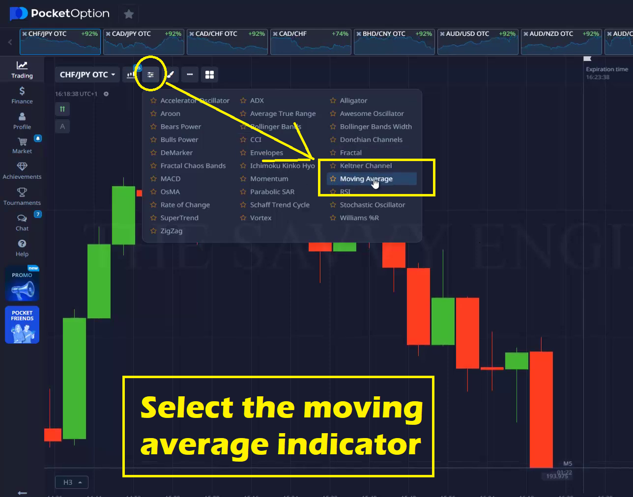 Let’s move to the third tab in which you will find indicators and oscillators, in this case we are going to use the Moving Average Indicator.