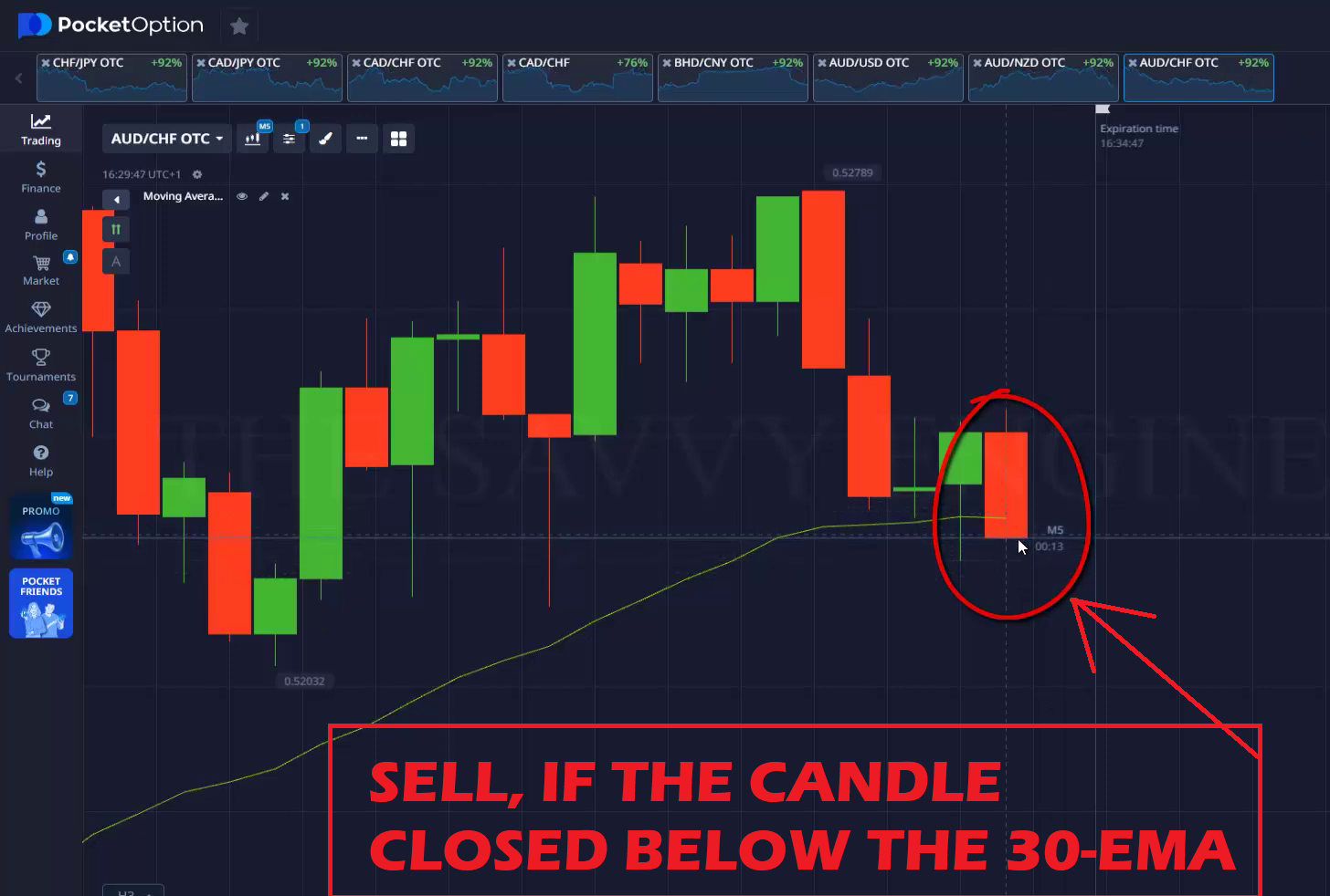 Place a 5 Minutes Sell Trade if the candle closed below the 30-EMA Indicator.