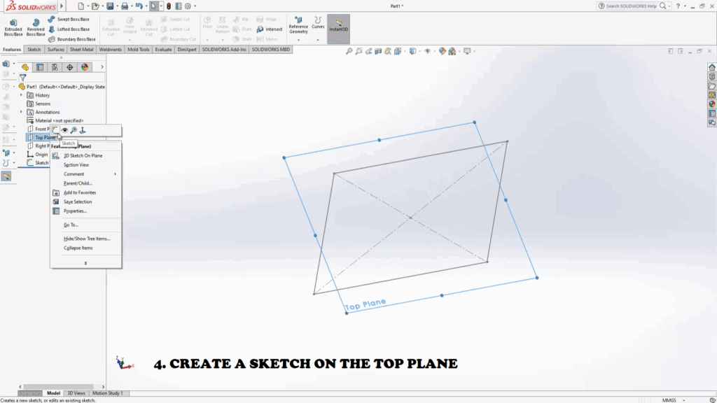 - The first step will be choosing the TOP PLANE; we need it to create a sketch on it.