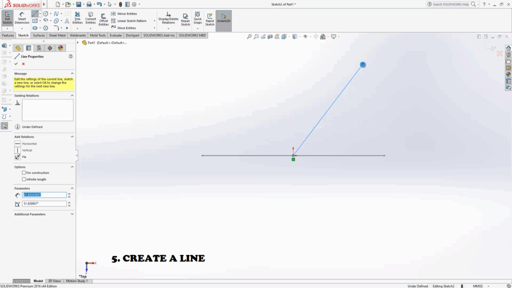 4. The next step will be selecting the top plane. We will create a new sketch, it will be a Line.