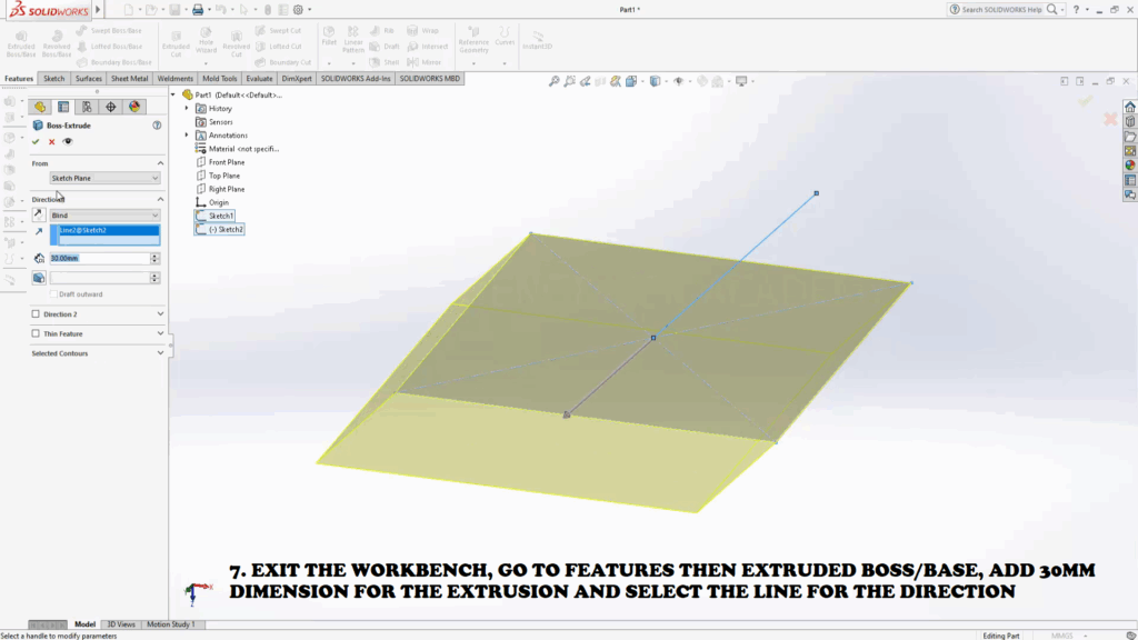 6. Exit the workbench, go to features, click on the extruded boss/base command, add 30mm for the extrusion dimension, then select the line for the pad direction.