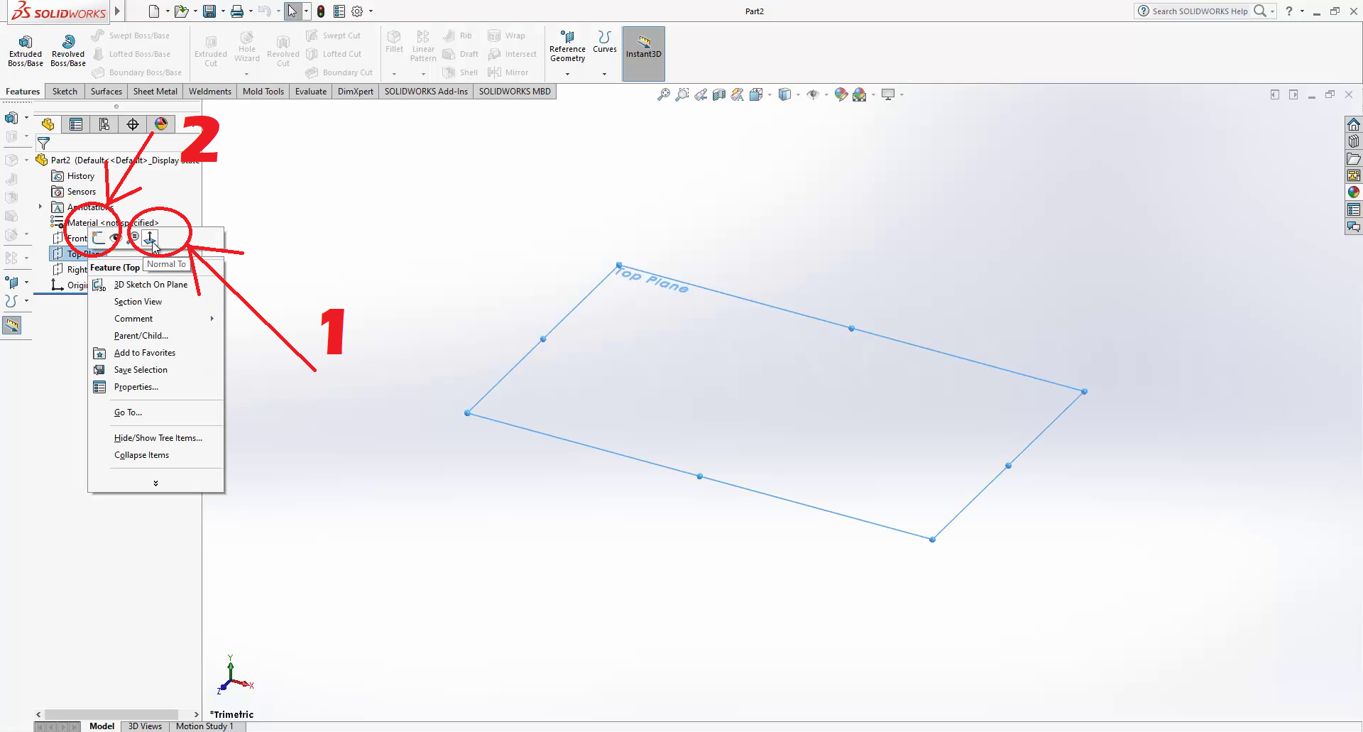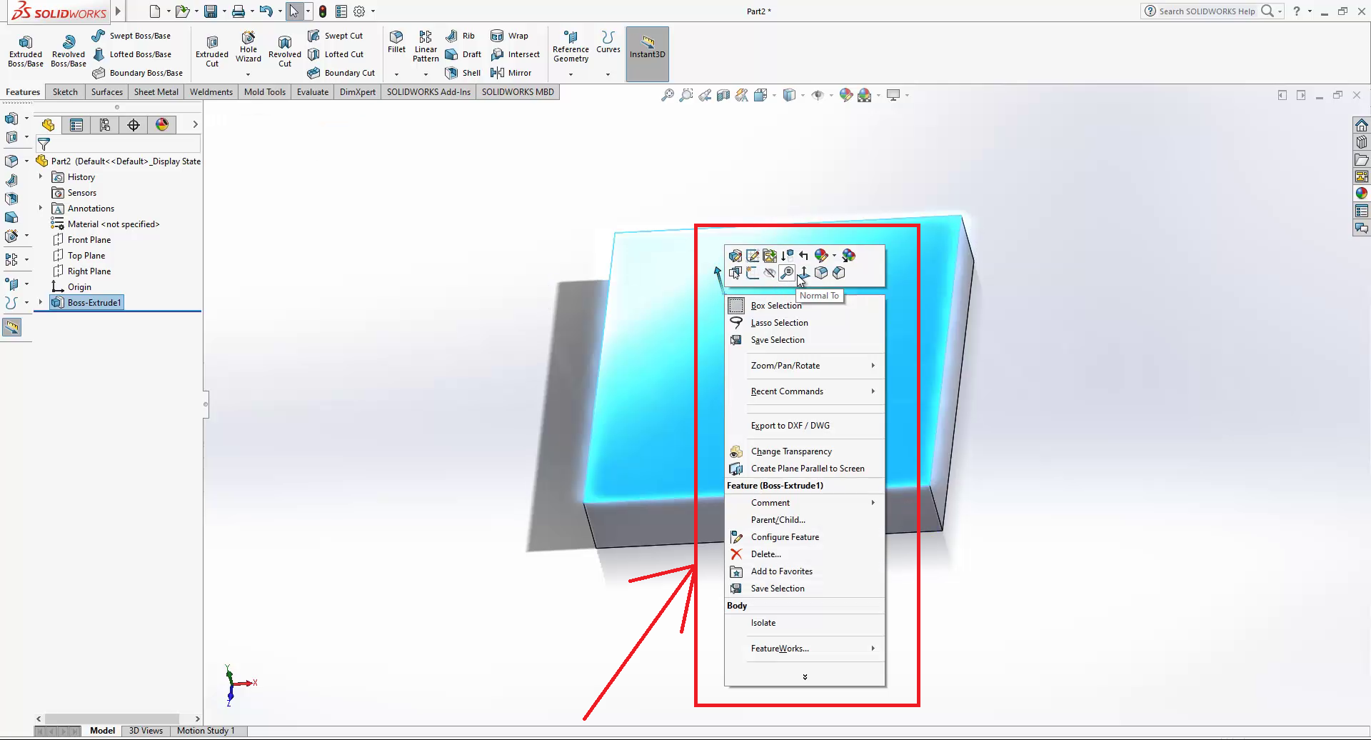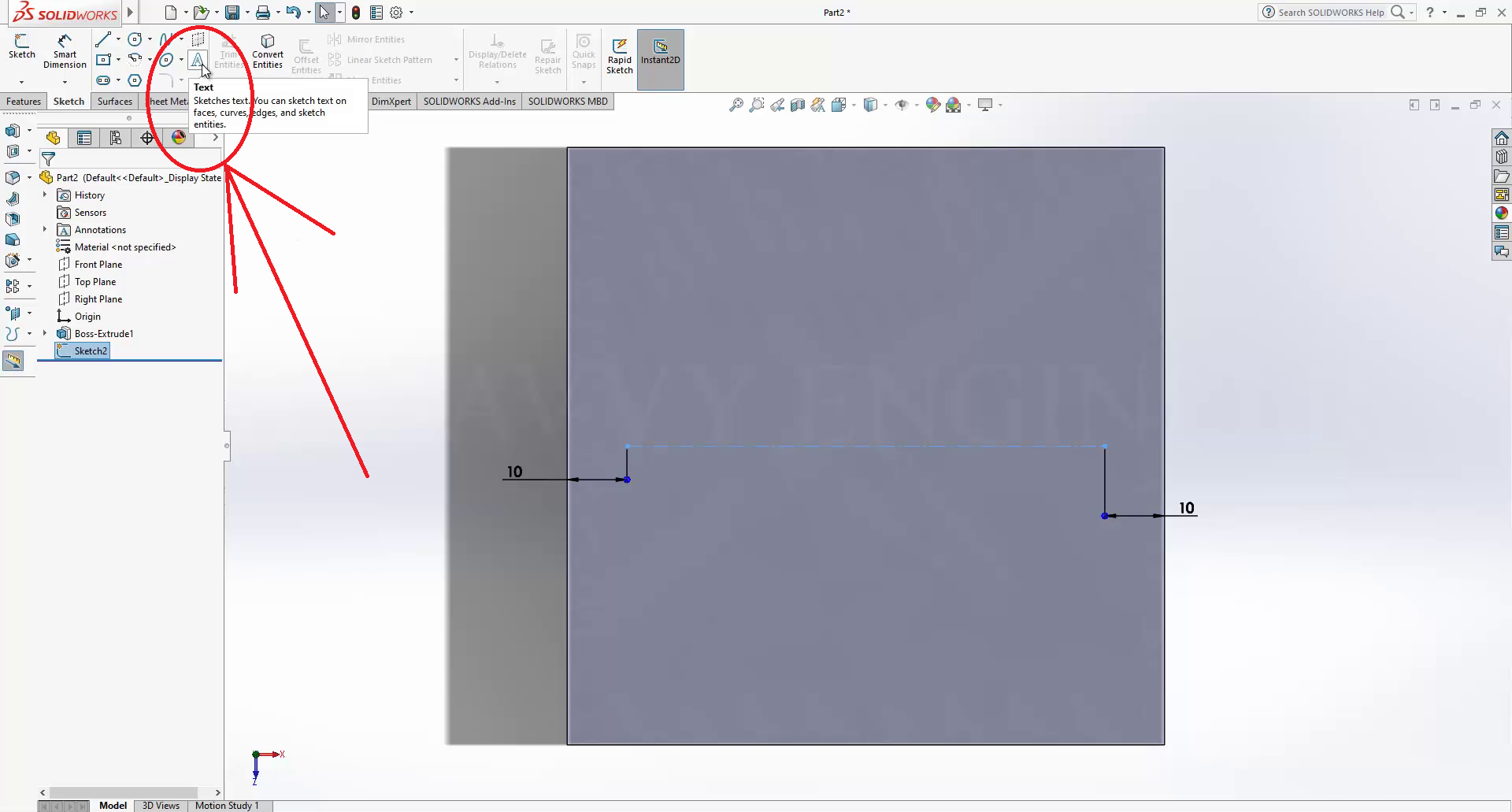 My plan here is to create an extrusion of 20mm then write a text on it. First, go to the top plane, do right-click, click on normal to, then on sketch.