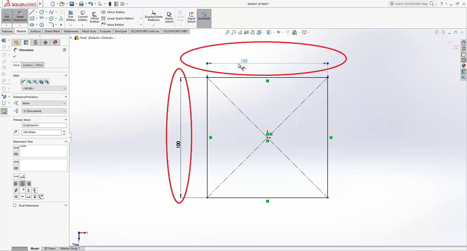 Use the smart dimension command to add a 100mm dimension to the width and the length. Click on ok, then exit the workbench.