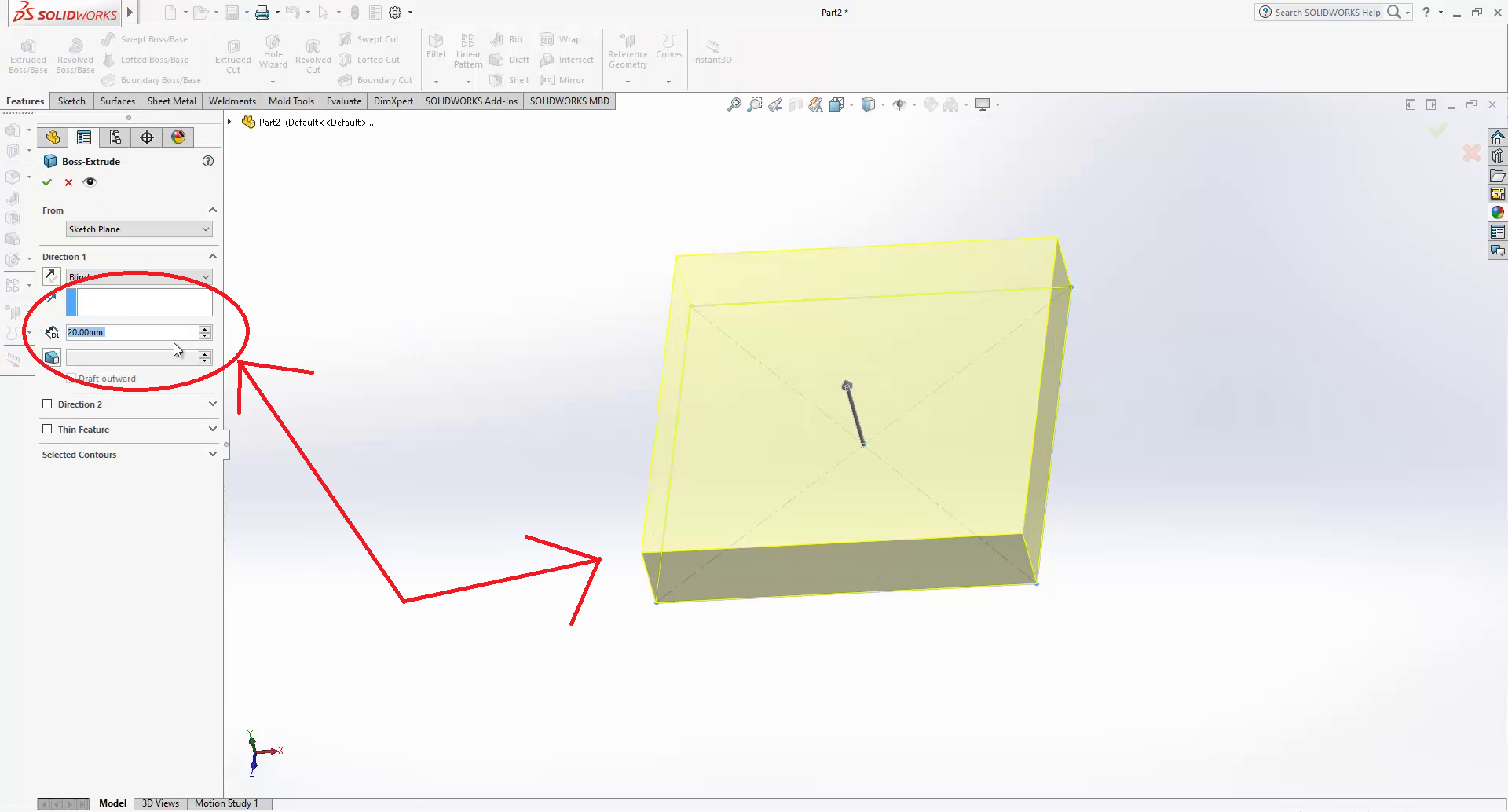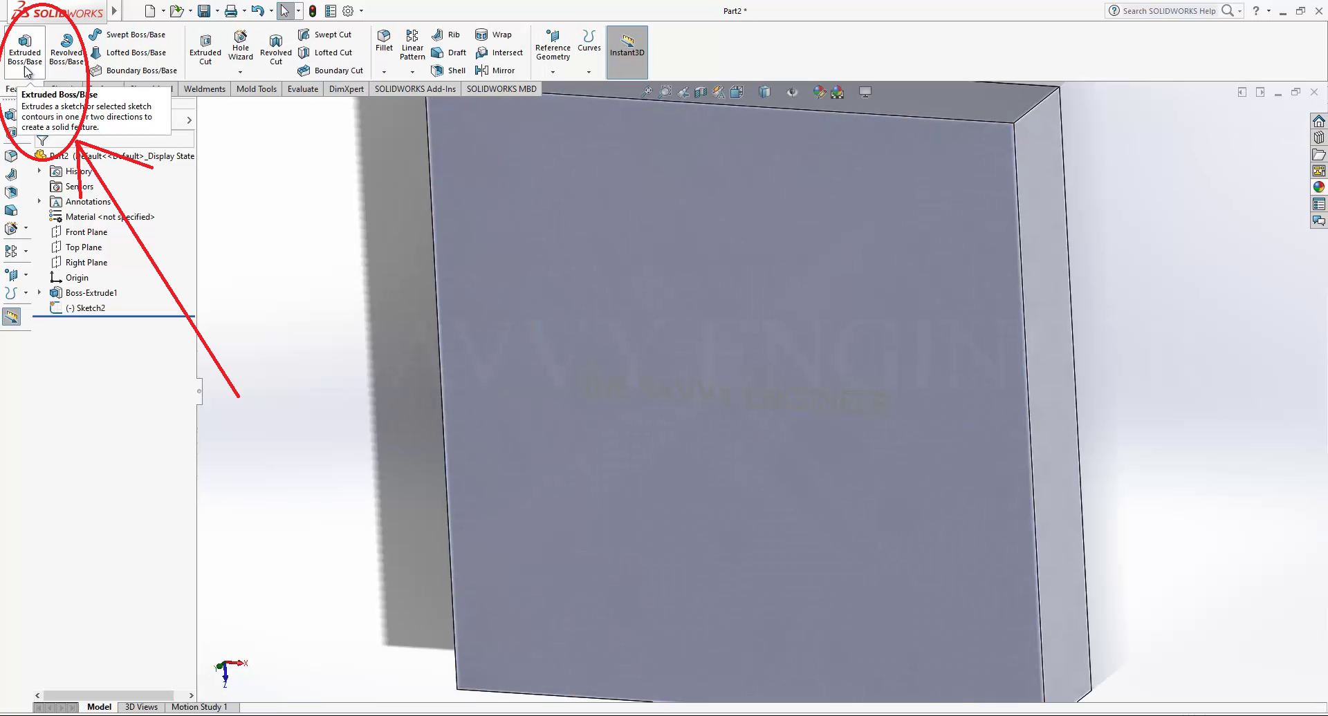 Go to features, then click on extruded boss/base.