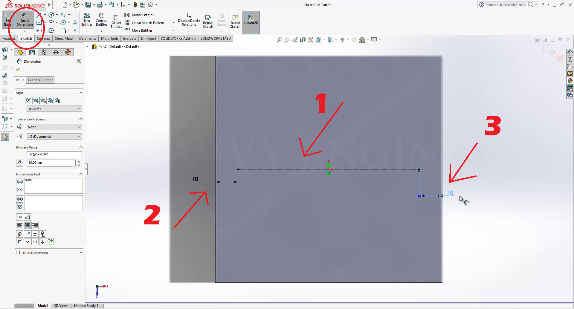 Draw a centerline passing through the point of the axis, then add a dimension of 10mm between the extremity of the centerline and the edge of the extrusion, see image below.