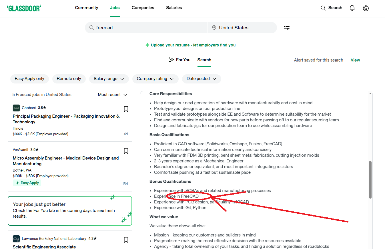 The platform also allows users to filter job listings by location, salary range, and company rating, making it easier to find roles that match their experience level. FreeCAD designers can upload resumes, set up job alerts, and even compare salary data to negotiate better pay.